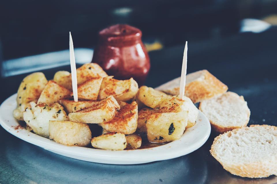 Now we’re going to the city center. It’s a typical tavern that, as a tourist, you wouldn’t think of entering. But we’re here to try their garlic potatoes dish. It’s a dish as simple as it is exquisite. This is their star pintxo. And don’t forget to sprinkle some paprika on top! It’s delicious!