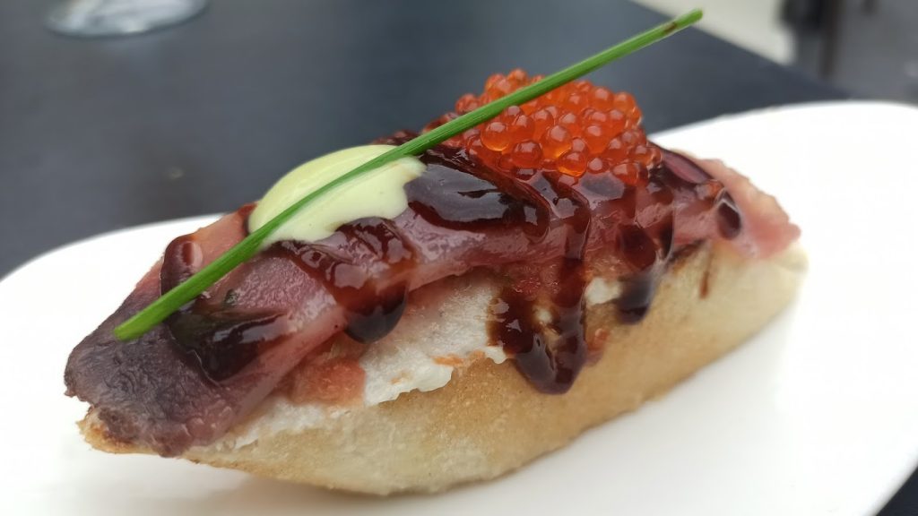This bar used to be called «lobo» in the past. New owners took over, but they kept the best pintxo from the bar. For us, it’s one of the best pintxos in the city: «Pintxo de atun rojo» (red tuna pintxo). This delicacy consists of raw red tuna on top of brandada de bacalao with vinaigrette, wasabi mayonnaise, and soy cream. It’s a delight. Just for this pintxo, it’s worth going to the Antiguo neighborhood.